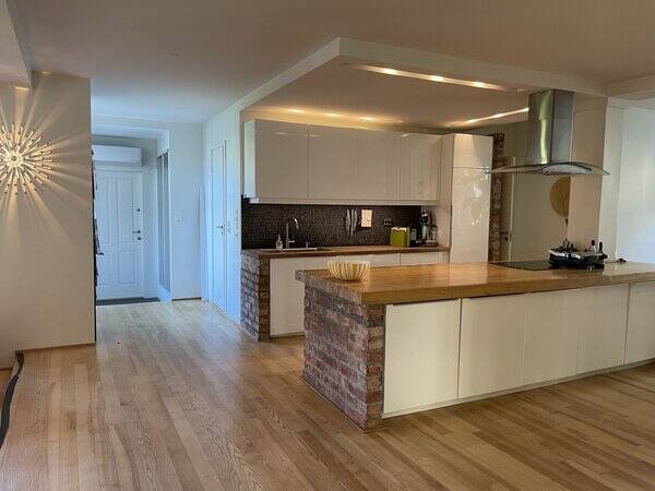 Veldig stor stue med åpen kjøkkenløsning, diger kjøkkenøy, leilighet i en hel etg i gammel fabrikk, 138m2