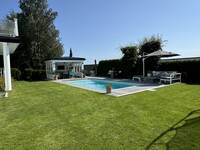 Hage med basseng og bassenghus.